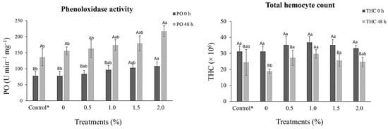 Immunological responses (mean ± standard deviation) to phenoloxidase activity (PO) and total hemocyte count (THC) of Penaeus vannamei (13.3 ± 0.3 g) before (0 h) and after challenge (48 h) with Vibrio alginolyticus (5.0 × 106 CFU) after 30 days of dietary supplementation with crude extracts from Porphyridium cruentum. (AB) Different capital letters in the same column indicate significant differences (p < 0.05) between the pre- and post-challenge periods. (ab) Different lowercase letters in the same line indicate significant differences (p < 0.05) between treatments. (*) Shrimp injected with a saline solution.
