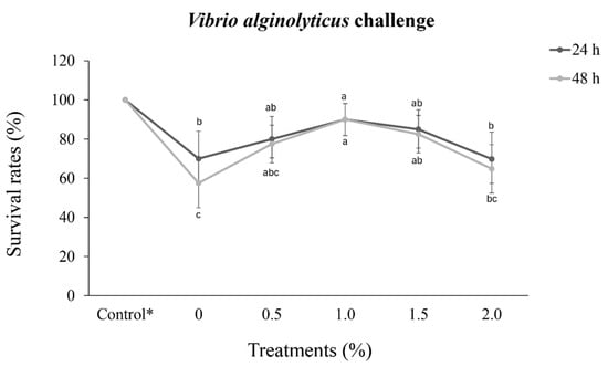 The lowest survival rate at 48 h post-challenge was recorded for the 0% control group (57.5%), and 48 h after challenge, the survival rates remained unchanged in the 1.0% treatment group, further revealing a significant difference in survival rate (p < 0.05) compared to that of either the 2.0% treatment or control groups (0%).