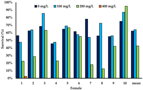 Percent survival of walleye (Sander vitreus) eggs from ten distinct females subjected to either 0, 100, 200, or 400 mg/L active iodine disinfection treatment for 10 min and mean survival by treatment.