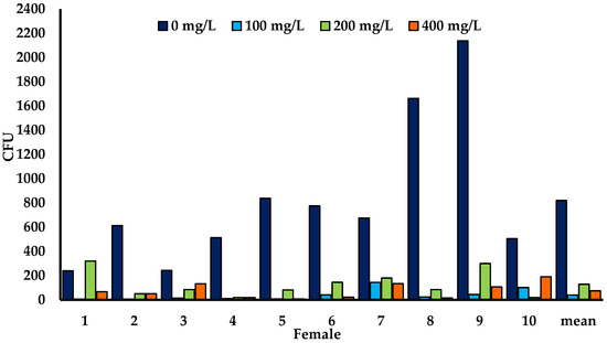 All the iodine treatments significantly decreased the CFUs compared to the untreated control eggs (Table 1). However, the CFUs were not significantly different among the 100 mg/L, 200 mg/L, and 400 mg/L treatment groups. The highest bacterial count was approximately 2100 CFUs, observed in the untreated eggs from female nine, while the lowest bacterial loads observed were in eggs from female five at approximately 10 CFUs in both the 100 and 400 mg/L iodine treatments. The mean CFUs from the untreated control eggs of this female were approximately 820 CFUs. The 200 mg/L treatment group experienced an approximate six-time reduction in bacterial CFU, while the 100 and 400 mg/L treatments produced an approximately 16 times greater reduction in CFU. CFUs by spawn from individual females by treatment are shown in Figure 2.