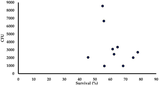There was also no significant relationship between egg survival and the control (pre iodine treatment) CFU (R2 = 0.089, p = 0.401; Figure 3). There was no significant relationship between egg survival and the post-disinfection bacterial numbers (R2 = 0.051, p = 0.161; Figure 4).