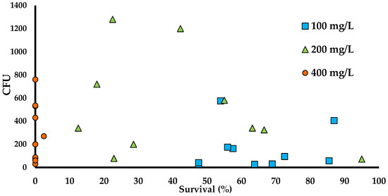 Bacterial Colony-Forming Units (CFUs) of walleye (Sander vitreus) eggs from ten distinct females subjected to either 0, 100, 200, or 400 mg/L active iodine disinfection treatment for 10 min and mean survival by treatment.