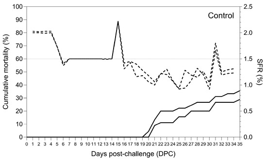 For all the study groups, the fish maintained a relatively constant SFR of 2% before treatment. During the 10-day treatment (DPC5-DPC14), the SFR was deliberately adjusted to 1.5–1.6% to ensure that the fish received the desired FFC dose (see Figure 4). After the treatment period, the SFR (%) showed more variation among the groups, with a significant decrease observed in the control group on DPC15, four days prior to the first recorded mortality. The SFR (%) ranged from 2.22% to 1.31% between the groups at that time. As the study progressed, all treatment groups demonstrated a higher SFR (%) compared to the control group. The two-way RM-ANOVA for SFR shows there are significant differences (and also trends between groups/p-values between 0.1 and 0.05) in several days post-treatment.