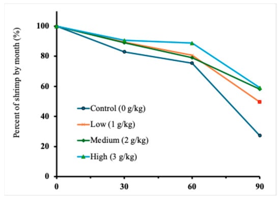 The results of the monthly survival of Pacific white shrimp during the grow-out phase (Table 5; Figure 1) showed that survival rates remained high across all treatments, ranging from 83% in the control group to 91% in the high-dose group. By the end of the second month, the survival rates ranged from 75% in the control group to 89% in the high-dose group. By the end of the third month, survival declined significantly in all the groups. The control group had the lowest survival rate, at 27%, which was significantly lower (p < 0.05) than that of all other groups. All the AMA supplemented groups, i.e., low, medium, and high doses, maintained higher (p < 0.05) survival rates of about 50%, 58%, and 59%, respectively, than that of the control (27%) with no significant difference among them. The medium and the high doses had more (p < 0.05) than twice the survival rate of the control group, which means the AMA was highly effective in terms of survival of shrimp during the grow-out phase. Therefore, regression analysis was performed to see the relationship (Figure 2) between survival and AMA dosage. The data analysis showed a significant quadratic model (y = −5.3788x2 + 26.530x + 27.591, R2 = 0.9969, p < 0.01, n = 12, Xmax = 2.5, Ymax = 60.3) that clearly indicated that the highest survival rate of shrimp (60.3%) could be achieved by applying 2.5 g of AMA product per kg of feed.