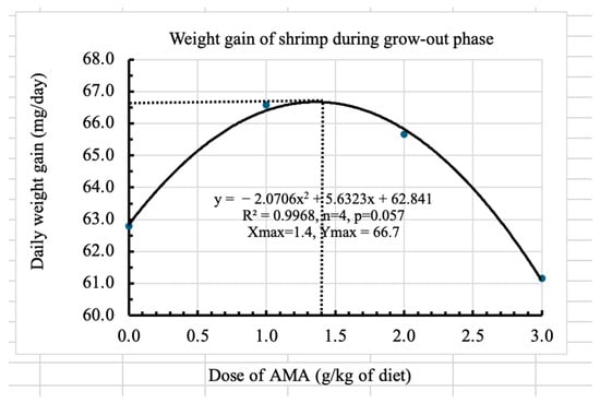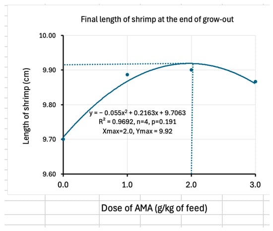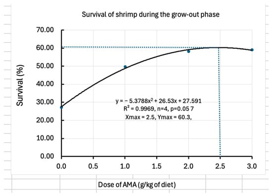 During the nursery trial, the survival rate was not affected, whereas during the grow-out phase, the survival rate had a significant quadratic relationship (p < 0.05) with the dose. The weight of shrimp was not affected, but the length did vary by the dose of AMA. Therefore, quadratic relationships of the dose of AMA with the shrimp survival and length have been used to determine the optimum doses (1.4–2.5 g/kg diet), which are described in the following sub-sections.