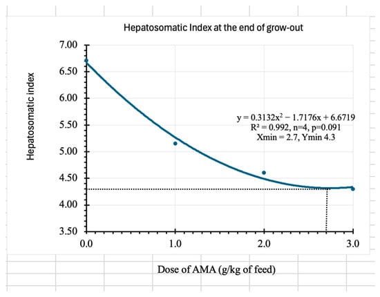 Similarly, the dose of the AMA exhibited a good quadratic relationship (Figure 3) with the daily weight gain of the shrimp (y = −2.0706x2 + 5.6323x + 62.8410, R2 = 0.9968), which showed the maximum daily weight gain of 66.7 mg could be obtained at 1.4 g of AMA per kg of feed. However, specific growth rate (SGR) did not show any clear trend. Growth performance is presented in Table 6. The length of the shrimp showed a clear relationship described by a quadratic model (y = −0.055x2 + 0.2163x + 9.7063, R2 = 0.9692, Xmax = 2.0, Ymax = 9.9). It showed that the highest length of the shrimp would be reached at the dose of 2.0 g of AMA per kg of feed (Figure 4). The hepatosomatic index (HSI) was significantly higher in the control. The inclusion of AMA significantly decreased the HSI, showing a negative quadratic relationship as represented by the equation, y = 0.3132x2 − 1.7176x + 6.6719, R2 = 0.5918, Xmin = 2.7, and Ymin = 4.3. The lowest HSI was achieved at the dose of 2.7 g/kg of AMA (Figure 5).