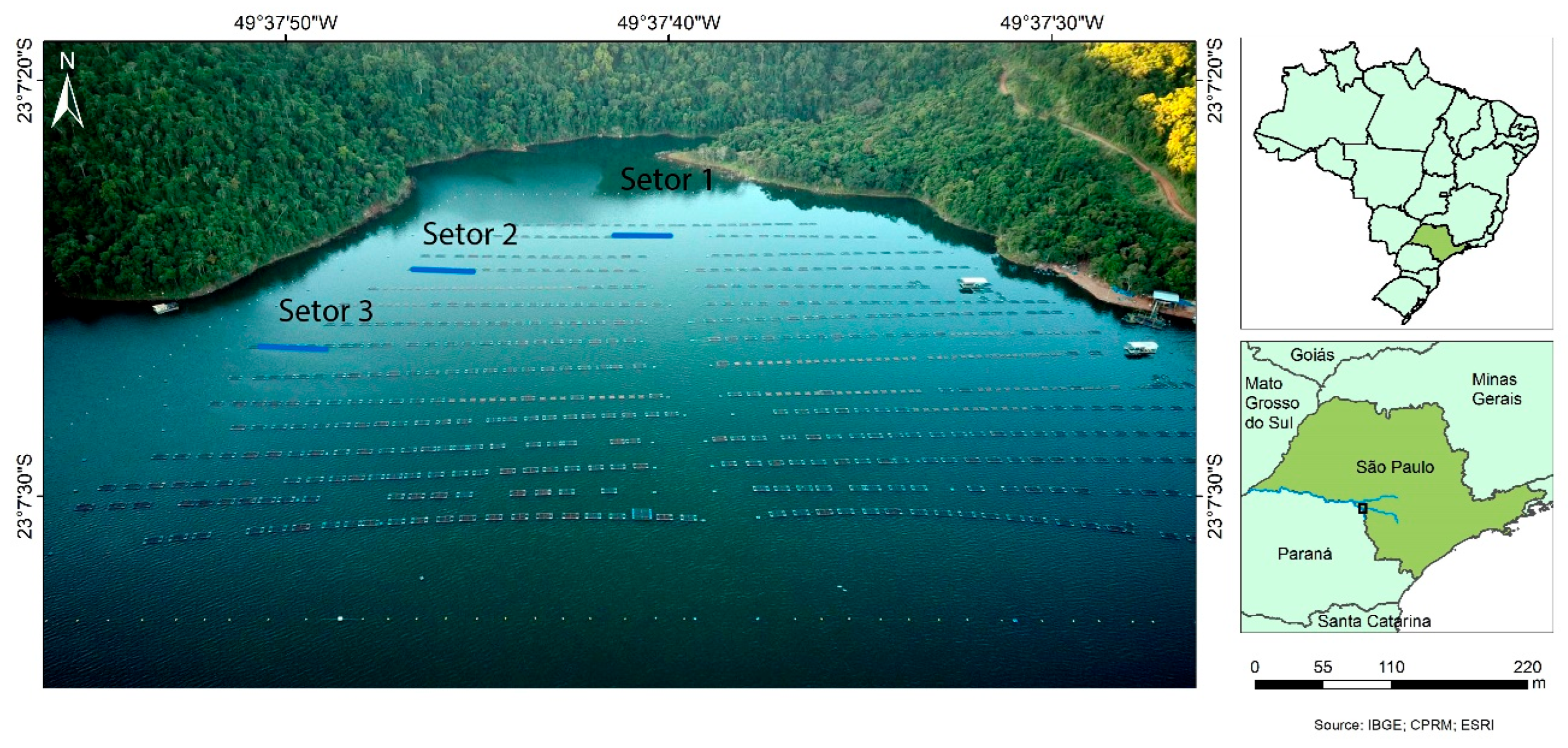 - Ayroza, D.M.M.R.; Nogueira, M.G.; Ayroza, L.M.S.; Carvalho, E.D.; Ferraudo, A.S.; Camargo, A.F.M. Temporal and spatial variability of limnological characteristics in areas under the influence of tilapia cages in the Chavantes Reservoir, Paranapanema River, Brazil. J. World Aquac. Soc. 2013, 44, 814–825. [Google Scholar] [CrossRef]