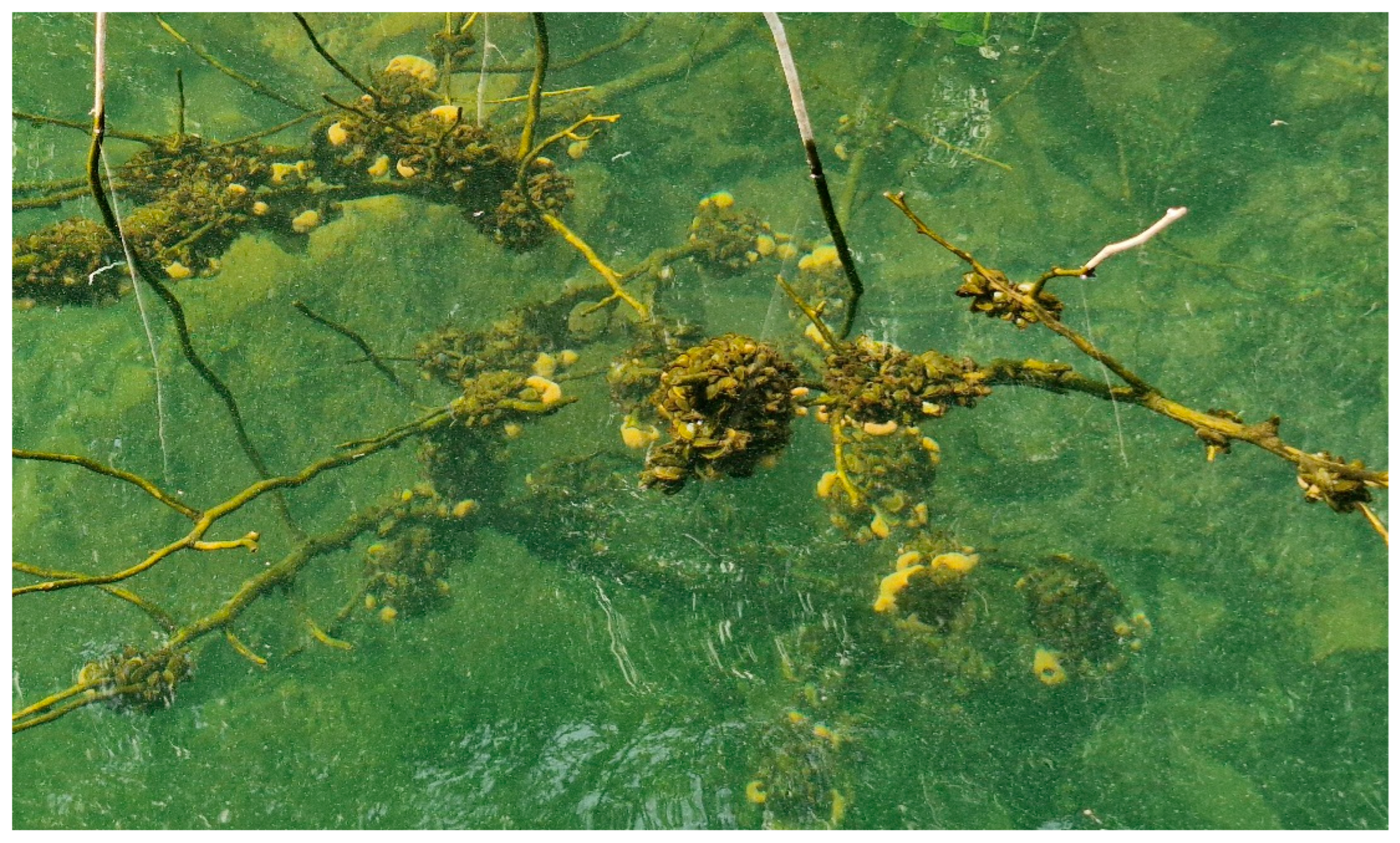 - Carballo, J.L.; Cruz-Barraza, J.A.; Domínguez-Monge, C.; Cano, C.; López-González, P.J. First report of the invasive freshwater sponge Heterorotula multidentata (Weltner, 1895) in Europa: A latent threat for aquatic ecosystems? Limnology 2024, 25, 235–246. [Google Scholar] [CrossRef]