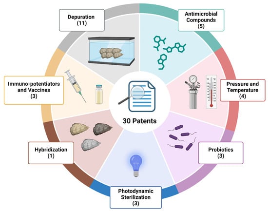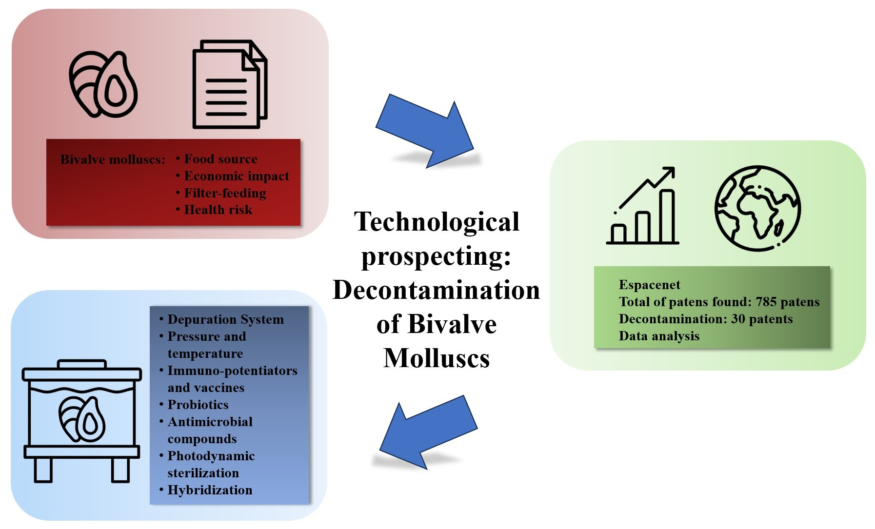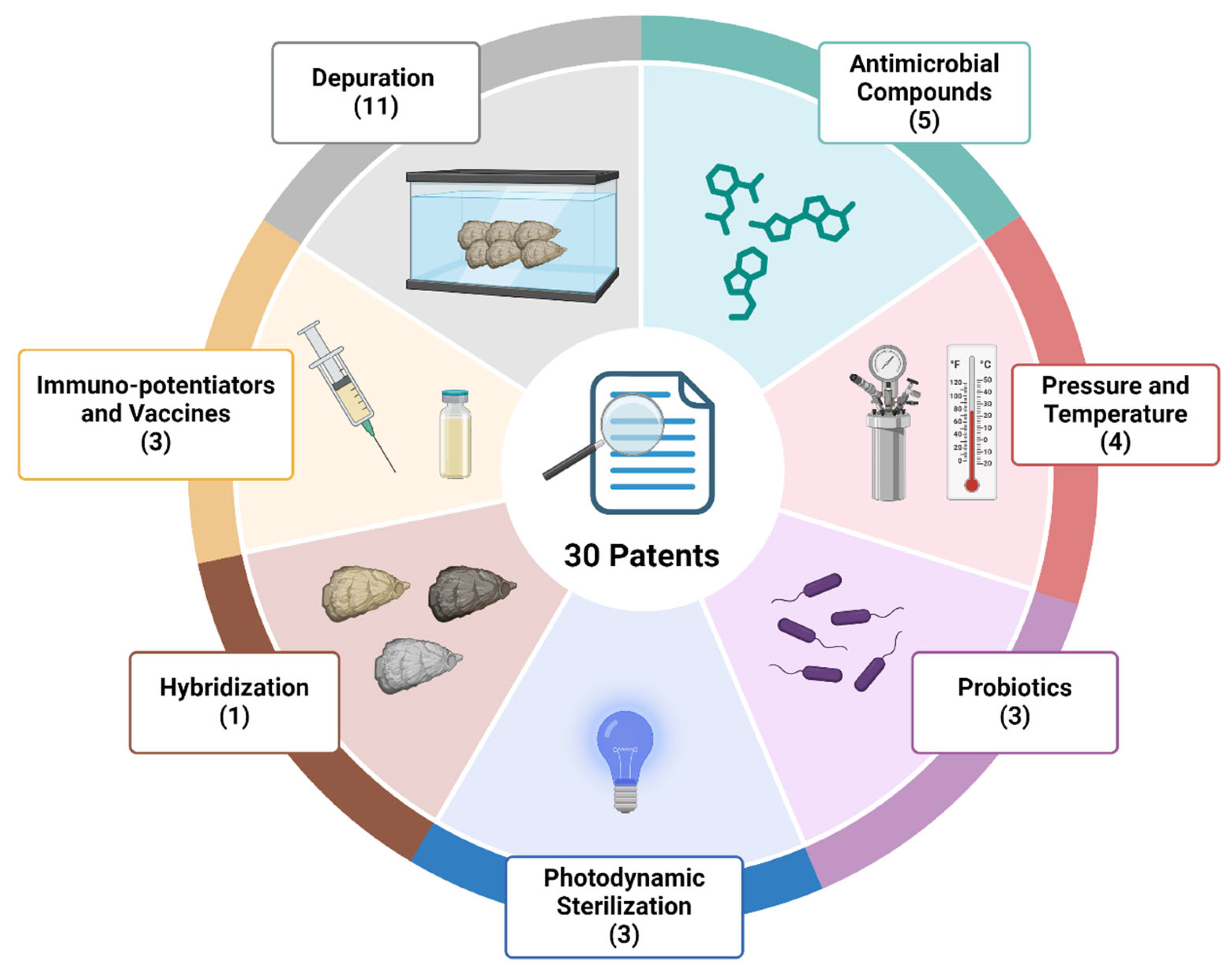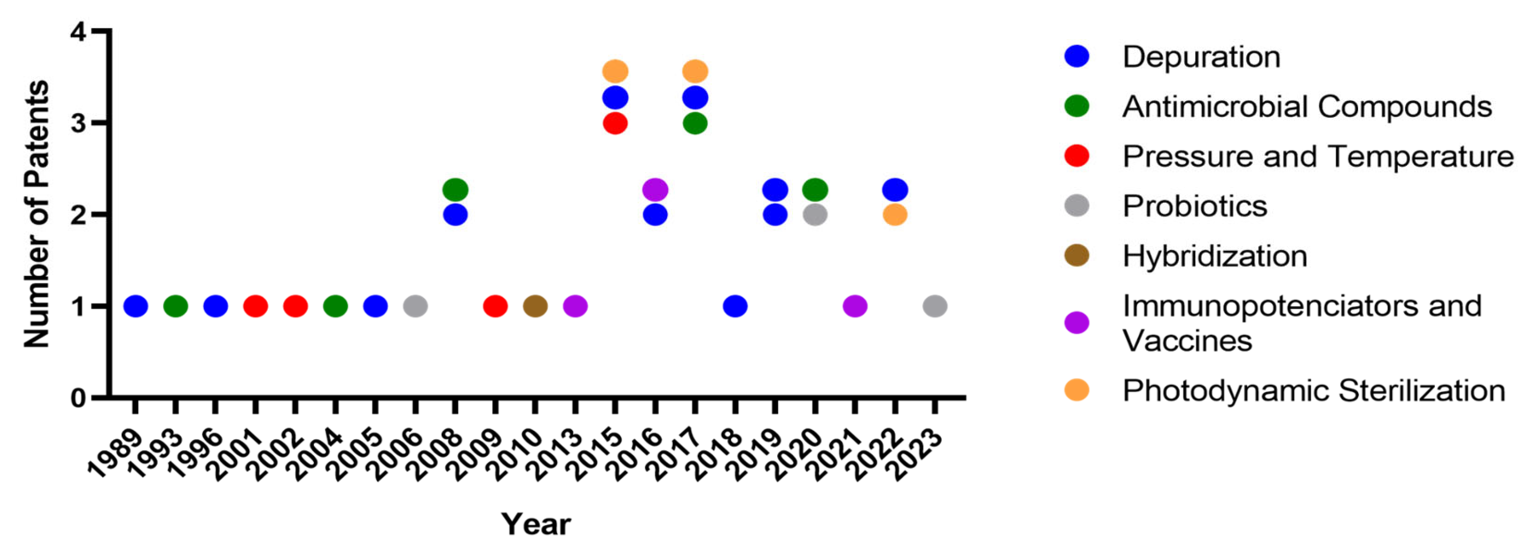 Provenzi, M.A.; Fongaro, G.; De Dea Lindner, J.; Nunes, I.L.; Savi, B.P.; Zanchetta, L.; Todorov, S.D.; Chikindas, M.L.; Miotto, M. Patent Landscape Analysis of Bivalve Mollusc Decontamination Technologies: A Review. Aquac. J. 2025, 5, 22. https://doi.org/10.3390/aquacj5040022