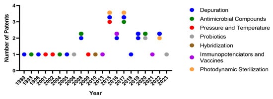 Chicago/Turabian StyleProvenzi, Marcel Afonso, Gislaine Fongaro, Juliano De Dea Lindner, Itaciara Larroza Nunes, Beatriz Pereira Savi, Lucas Zanchetta, Svetoslav Dimitrov Todorov, Michael Leonidas Chikindas, and Marilia Miotto. 2025. "Patent Landscape Analysis of Bivalve Mollusc Decontamination Technologies: A Review" Aquaculture Journal 5, no. 4: 22. https://doi.org/10.3390/aquacj5040022