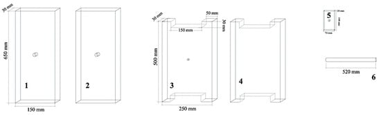 Plan of dimensions of the six primary wooden components used to construct the semi-mechanized sewing machine designed for planting Kappaphycus alvarezii seaweed. Parts 1 and 2 serve as the side pieces, parts 3 and 4 form the upper and lower bases, part 5 supports the sewing needle, and part 6 provides support for the spool of thread used to sew the seaweed onto the main handle.