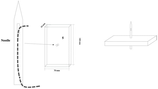 Additionally, the upper base (part 3) has a central hole (±3 mm Ø) for passing the needle and thread for sewing (Figure 1). In part 5, as shown in Figure 2, the sewing needle is secured. A hollow sack needle was used in this project, with the thread passing through its interior and exiting at the apical part of the needle (Figure 2). Part 5 should be attached to the upper base of the apparatus to complete the setup of the low-cost S-MS machine (Figure 3). The wooden parts can be joined according to the executor’s preference, and aluminum nails were used to prevent corrosion. It is believed that other materials such as aluminum or high-density polyethylene can also be utilized in the production of this model.