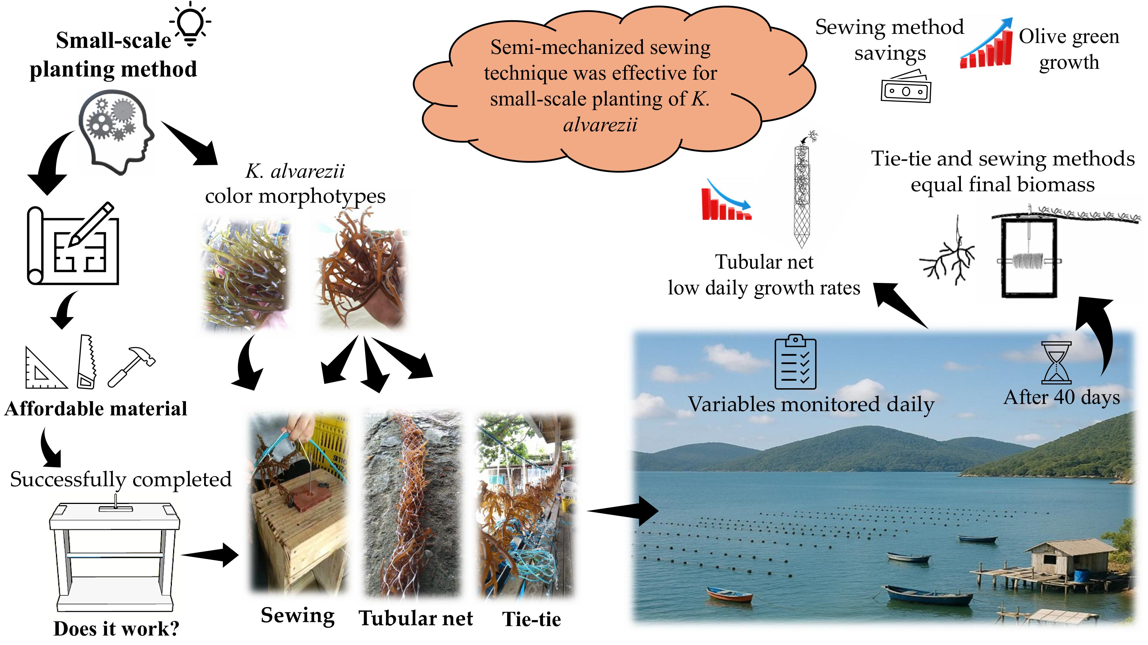 This study introduced a straightforward device and thoroughly showcased a novel S-MS approach for small-scale planting of the red seaweed K. alvarezii. The results indicated the effectiveness of the S-MS method when compared to other established tie-tie and tubular net methods, based on the data on material savings, human labor, and seaweed yield obtained. We are confident that this model can be widely adopted in various regions of Brazil and globally to streamline the cultivation of K. alvarezii and enhance the economic prospects of small coastal communities.
