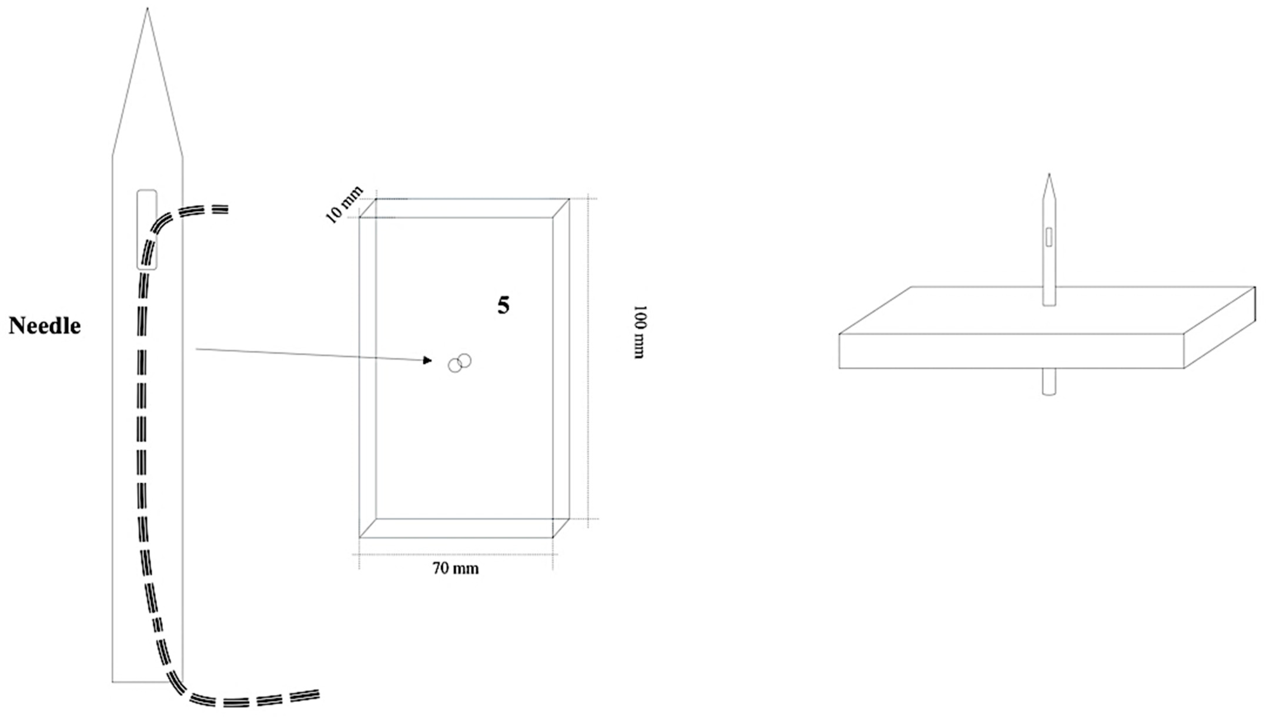 Figure 2, the sewing needle is secured. A hollow sack needle was used in this project, with the thread passing through its interior and exiting at the apical part of the needle (