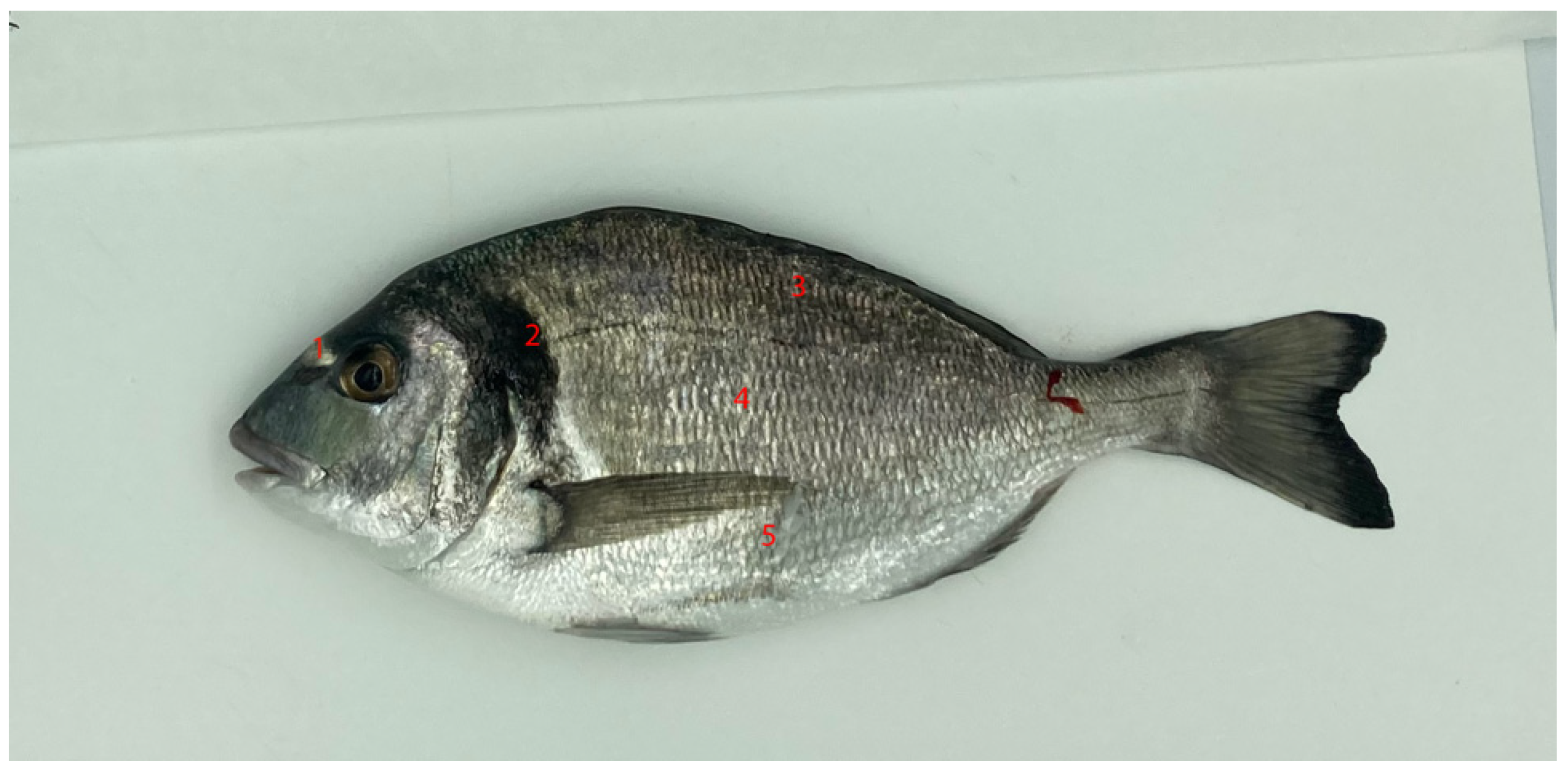 - Malandrakis, E.; Zantioti, C. Determining skin pigmentation of gilthead seabream Sparus aurata: A comparative approach of chromatometry and digital photography. In Proceedings of the Conference: Aquaculture Europe 2021, Funchal, Portugal, 4–7 October 2021. [Google Scholar]