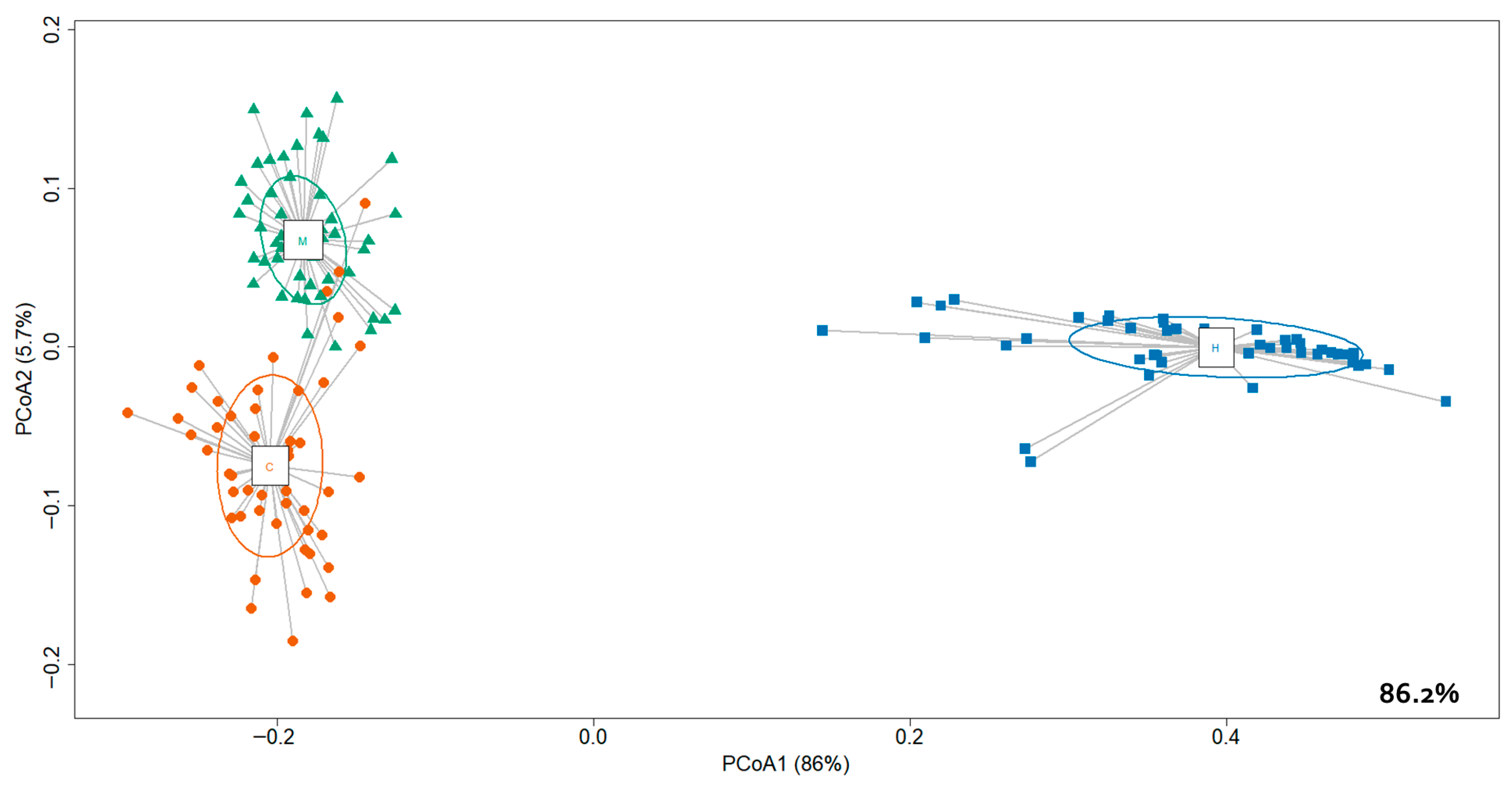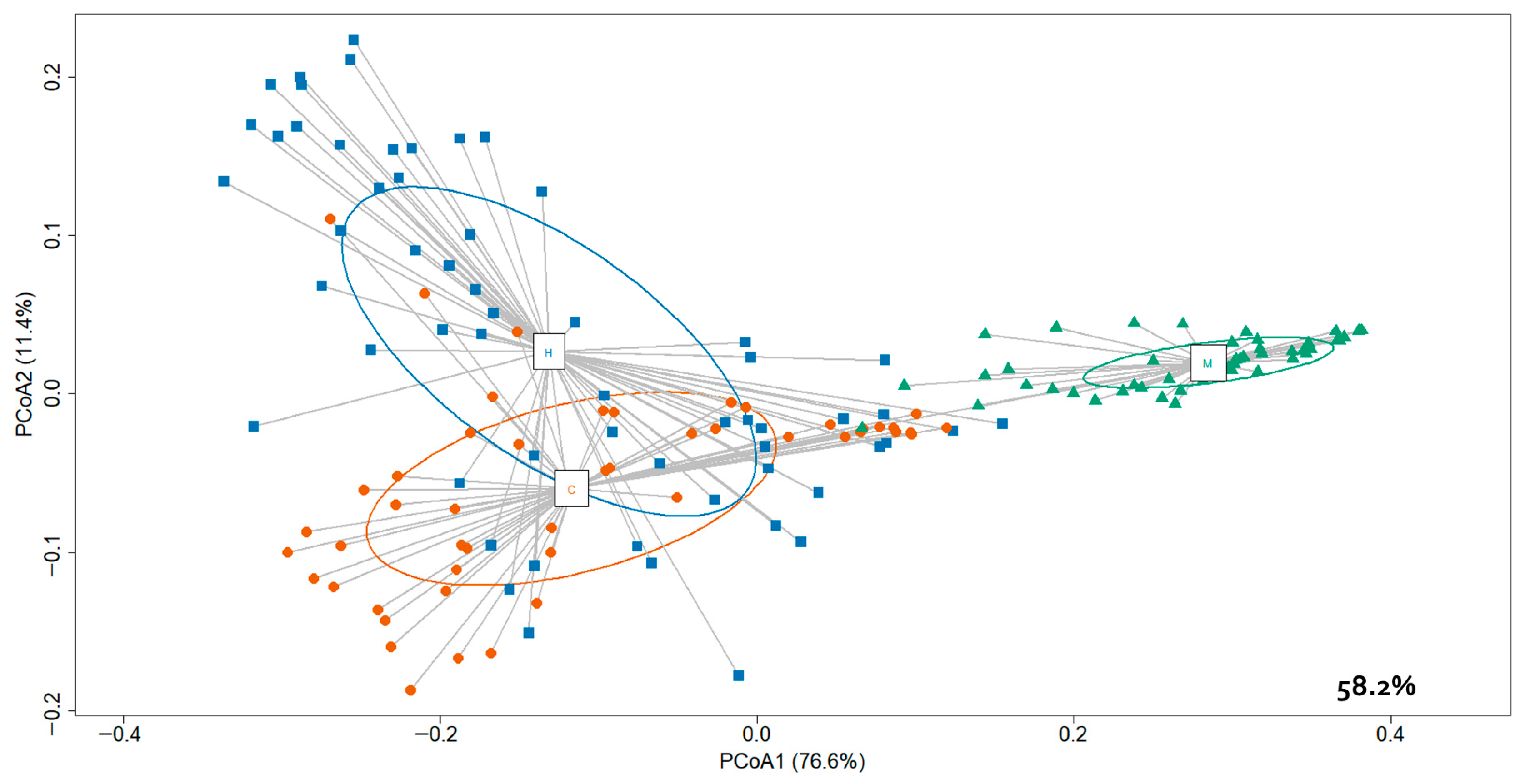 - Oksanen, J.; Simpson, G.; Blanchet, F.; Kindt, R.; Legendre, P.M.P.; O’Hara, R.; Solymos, P.; Stevens, M.; Szoecs, E.; Wagner, H.B.M.; et al. Vegan: Community Ecology Package, Version 2.6-4; R Foundation for Statistical Computing: Vienna, Austria, 2022.