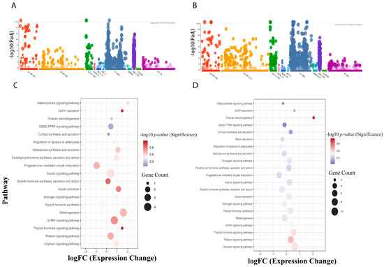 Enriched functional annotations and endocrine pathways for differentially expressed genes (DEGs) in the optic lobe (A,C) and oviducal gland (B,D) of Octopus mimus females. Panels (A,B) illustrate significantly enriched Gene Ontology (GO) terms, including Molecular Function (MF, red), Biological Process (BP, orange), and Cellular Component (CC, green), together with pathway annotations from KEGG (pink), Reactome (blue), WikiPathways (turquoise), Transcription Factors (bluish-gray), microRNA (aqua green), Human Protein Atlas (violet), CORUM (light green), and Human Phenotype Ontology (magent). Panels (C,D) depict enriched KEGG endocrine pathways inferred through orthologous genes from Octopus bimaculoides. Comparison is between females exposed to constant light (24:0) with egg-laying inhibition and those under a normal (dark/light) photoperiod, highlighting photoperiod-dependent modulation of key neuroendocrine pathways.