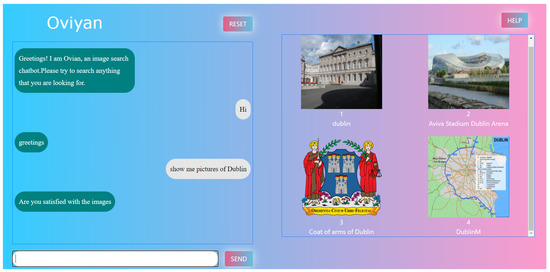 The keywords from the conversation are extracted using the Entity extraction component and then the extracted words are given as input to the Wikipedia API for image search. For example, Question: Show me something about Dublin. Output from entity extraction: Dublin. If the chatbot is not able to identify any keyword from the user input through entity extraction, it prompts the user to provide a valid input. The image search management is responsible for displaying relevant images. Here, the image search box displays the top four images from the search results of Wikipedia API. The images are listed using numbers. If the users are looking for images related to any image that has been displayed, then giving the number as input to the chat bot will enable the chat bot to look for more specific results. The image search extracts images from Wikipedia pages of the given keyword, and only the images that contain the keyword are being extracted and shown to the user. An average of twenty relevant images will be shown for every search. The suggestions about the relevance of the image will be enquired through the conversation management, which works together with the image search in sync.