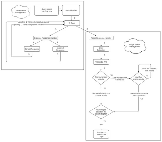 The system workflow mainly has the two sections, viz., conversation management and image search management, as shown in Figure 2: