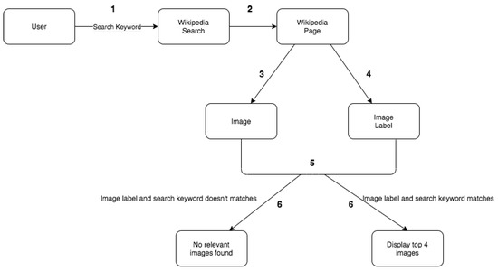 - Image search algorithm:Our prototype conversational agent adopts a logic-based system to filter out images from the collection of images provided through the Wikipedia API. From the user input, the search keyword is extracted and used as input to the Wikipedia search API, which retrieves all the Wikipedia page titles based on the search keyword. These titles are then used as input to retrieve relevant Wikipedia pages. Then the images from these pages are extracted along with their labels and compared with the search keyword. If it matches, then the first twenty images are used for display purpose to the user. The entire flow has been shown graphically in Figure 3. We have taken care of all the exceptions that might occur during the search process. The algorithmic flow of the image search logic is as shown in Algorithm 1.