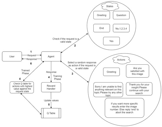 The SUS, UEQ, and the CUQ scores were calculated and found to be above average. This infers that the users found the application easy to use and had a very good user experience. From this research work, we conclude that reinforcement-learning-enabled conversational agents can be implemented to answer search queries in various use cases. This study is a user pilot study, and the results will be used to evaluate further with more subjects, and the states’ rewards can be refined with the feedback gained from observations of the user study. The future prospective of this study could be to perform comparative studies between two different versions of the system, one implemented with the help of reinforcement learning, and the other without. The advantages and limitations of a reinforcement-learning-based system could be investigated in comparison with deep-learning-based and rule-based systems.