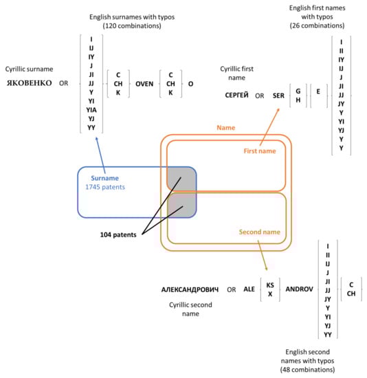 To figure out where all the patents ended up, it was necessary to apply transliteration rules from Cyrillic to the Latin alphabet. For example, Ikovenko’s I can appear under the following combinations (I = J = Y = Yi = Yy = Iy = Ii = Ij), the Я on the other hand (Я= Ya = Yia = Ja = Ia = Iya = Jja = Iia = Yya = Yja = Jia = Jya = Ija) and finally ko is also Ko = co = cho. The complete list of substitutions is shown in Figure 1.