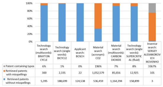 Figure 3 graphically represents the comparison between the retrieved patents with and without misspellings in each considered patent search, i.e., description/claims/title fields, by using acronym, single words, multi-words about a technology (i.e., BRAYTON CYCLE, BICYCLE) or a material (i.e., CO2, SUPERCYTICAL fluid, CARBON DIOXIDE), in the applicant field (i.e., BOSCH) and in the inventor field (i.e., SERGEI ALEXANDROVICH IKOVENKO).