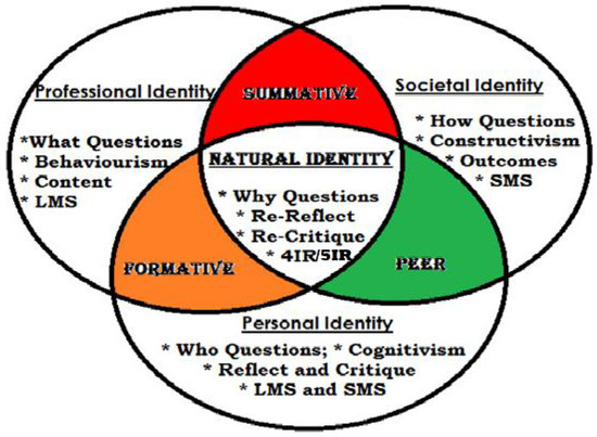 However, personal identity may take the form of student- or academic-centredness because it addresses the “who” questions such as who needs the action of teaching and learning, inter alia. Personal identity focuses on the beliefs or philosophies that underpin the actions and their outcomes [6,32,34]. Educational actions are driven by specific situations. The individual needs are being addressed [35]. Although the educational actions and outcomes reflect underpinning beliefs, they may only represent the user interface, not objective realities (natural identity) [5,36].