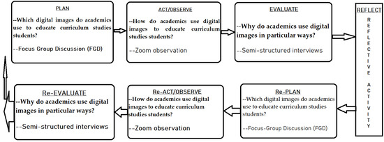 The PAR stages were used to frame the methodology for this study. These stages were employed to guide image-reflective activities, Zoom observation, focus-group discussions (FGD), and semi-structured interview data-generation methods effected in both phases of the PAR. McDonald [44] asserts that PAR is a research methodology in which participants and researchers are actively engaged in making informed decisions which generate practical knowledge to improve their professional, societal, and personal lives. Morales [45] adds that PAR merges action and reflection in participants together with others in order to forge practical solutions. This suggests that PAR with its stages (plan, act, observe, evaluate, and reflect) is carried out to make a useful contribution to individuals’ understanding and knowledge and how that knowledge defines their identity, affecting, either positively and/or negatively, their practice. For this study, Stage One (plan and re-plan) addressed Research Question One in both Phase One and Phase Two through FGDs. Stage Two (act/observe and re-act/observe) addressed Research Question Two in both Phase One and Phase Two through Zoom observation. Stage Three (evaluate and re-evaluate) addressed Research Question Three in both Phase One and Phase Two through semi-structured interviews. Stage Four (reflect) addressed all the research questions through reflective activities by concluding Phase One and introducing Phase Two.