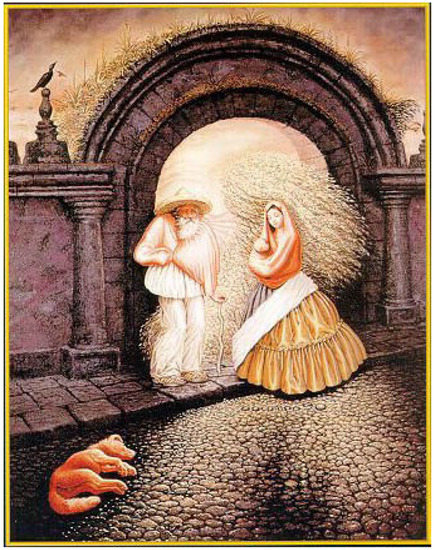Figure 7 shows a bust of an old man under an archway; pillars stand either side of the old man. Above the pillar on the left, there is a carving with a bird atop it. The man’s hand can also depict a reclining dog. An old man is standing on the face of the old man. On the man’s ear is reflected a woman carrying her baby. To the left and right of the carving are four faces. Two look towards each other, and one looks to the front but merged with the face to the left of the carving. A less obvious face is seen to the right of the bird. Above the pillar on the right, a fifth face looks to the right. “Our students were able to identify all the pictures because they were trained by the observation of the previous pictures…” (P8, supported by others).