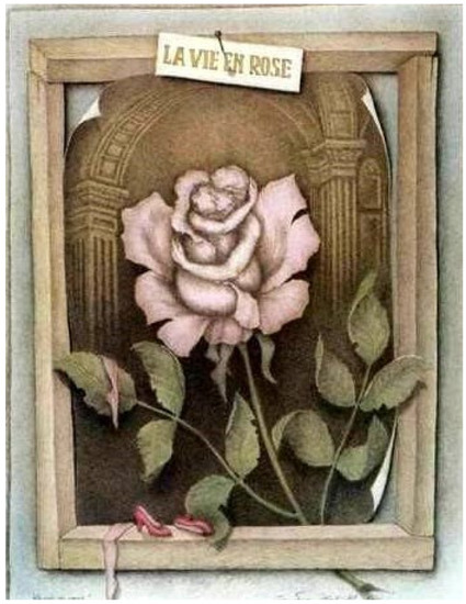 Figure 8 shows a rose (la rose) surrounded by a frame, the pillars in the background as the larger picture. In the heart of the rose, a couple is embracing. This demonstrates the French meaning of the caption: La vie en rose (life in the pink; life when in love). There are also small images of stockings and shoes to the left of the flower. “The majority of students saw the kissing couple and later saw the other pictures…” (P5, supported by others).