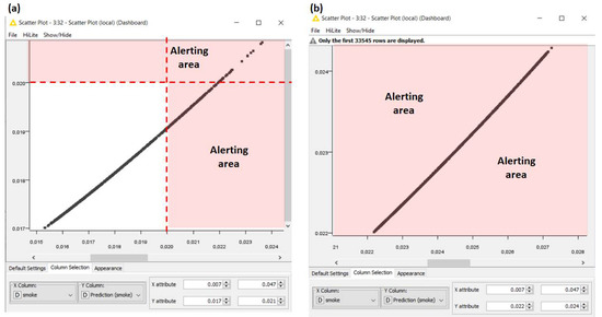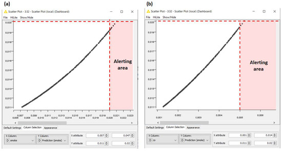 Figure 7. KNIME ANN-MLP algorithm predicting smoke variable. Plots of smoke versus predicted smoke (a), and co versus predicted smoke (b). The red area represents the alerting condition.