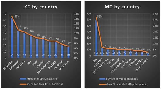 In terms of the literature origins, the leading analyzed publications came from Romania for KD (64, 17%) and from the USA for MD (32, 4%); however, our study has a global approach relying on the published specialized literature from more than 55 countries for KD and more than 25 for MD. More details are given in Figure 1.