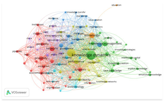 The network graphics are made using VOSviewer software. The size of the nodes and words on the graph represents their weight. The greater the node and word frequency, the larger the weight. The colors represent how closely two keywords are related to one another, and the nodes with the same colors are regrouped into a cluster. The distance between two nodes reflects the strength of the relationship between them. The length of the line describes the relationship between two words and the thickness of the line underlines their co-occurrences level. VOSviewer portrays the keywords of KD-related publications into seven clusters. The green cluster (Figure 2, cluster 2, center-left, 18 items) focused on the main concept of “knowledge dynamics”, its model, and its attributes. Below Table 5 exposes this representative second cluster, in green color, to acknowledge the structure and relevant information provided by VOSViewer.