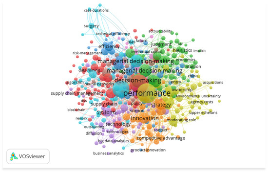 The red cluster (Figure 3, cluster 1, center-left, 70 items) is concentrated on the “management” “design” and framework” in relation with MD, while the green cluster (Figure 3, cluster 2, center-right up, 54 items) emphasizes “decision making” and its associated “behaviors”. The dark-blue cluster (Figure 3, cluster 3, center-up, 54 items) underlines the “efficiency” of the MD “model”. The fourth and yellow cluster (Figure 3, cluster 4, center, 50 items) regroups around “performance” as KD’s both trigger and consequence; while the purple cluster (Figure 3, cluster 5, center-left down, 50 items) strengthens the “impact” of “managerial decisions” on existing “systems”. The sixth and sapphire blue cluster (Figure 3, cluster 6, center-left, 50 items) focuses on the MD’s “model”, while the eight cluster in light brown (Figure 3, cluster 8, center-up left, 12 items) emphasizes the “complexity” and “perspectives” of decision making processes. The last cluster in pink (Figure 3, cluster 9, center-up, 11 items) underlines the “risks” of “failure”, the “costs” and the importance of an agile MD “strategic planning”.