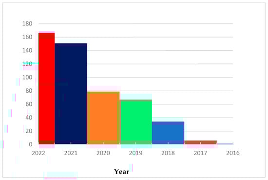 Table 3 shows the citations for 2016–2022, and the average number of citations per document was 2.80. Furthermore, citations per author were 18.38 with an H-index of 45 and a G-index of 90. In addition, top-cited publishers and journals on network visualization analysis, supply chain, blockchain and AI shown in Table A1. During the introductory period from 2016 to 2017, only one paper was published in this specialized field, compared to six in 2017. In 2018, these research topics attracted the attention of scholars, resulting in an increase in the number of publications (Table A2) The most cited papers (Table A3), publishers (Table A4) and journals (Table A5) were included in the Appendix A. Moreover, the authors included in the Appendix A are Francisco and Swanson [] (Logistics, MDPI), Kamble, Gunasekaran, and Sharma [] (International Journal of Information Management, Elsevier), Kouhizadeh, Saberi, Sarkis [] (International Journal of Production Economics, Elsevier), Salah, Nizamuddin, Jayaraman, and Omar [] (IEEE Access, IEEE).