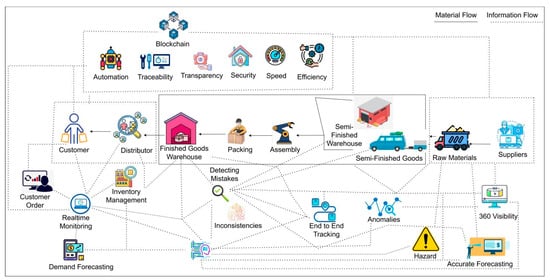 This study was developed following the revised model/framework to implement a distinguishable and automated supply chain. Figure 4 depicts an advanced scenario with blockchain installation and an intelligent supply chain adapted from the literature [].