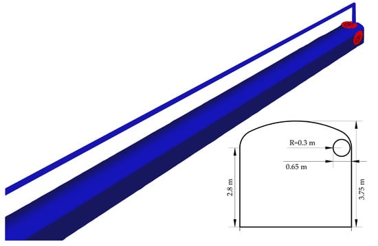 The research object is one cross-section of the roadway at a depth of approximately 580 m below the surface. The section’s size and its corresponding 3-D model constructed in Ventsim are shown in Figure 1. It is a three-core arch structure with an area of 14.04 m2. The width, wall height and arch height are 3.95 m, 2.8 m and 0.95 m, respectively. Facilities such as cables and supports inside the roadway were not taken into consideration. The amount of explosives used each time are about 40 kg and the temperature is around 300 K. It is worth pointing out that the ventilation duct was placed off the roadway in this software for the convenience of real-time viewing of ventilation performance.