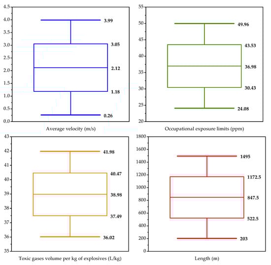 Toxic gas production is susceptible to a variety of influencing factors, such as the sort of explosives [], the environment of the roadway [], the type of blasting design, the method of detonation, and so on []. Therefore, the amount of toxic gases produced in each detonation varies slightly. The #2 rock emulsion explosive was adopted in this study. The toxic gas volume per kg of explosives in the underground roadway is from 36 L/kg to 42 L/kg, as given by Wang []. In addition, the length of the roadway is increased with the continuous construction of excavation engineering. Herein, the range from 200 m up to 1500 m was studied. Figure 2 presents the minimum, lower quartile, median, upper quartile and maximum for each parameter in boxplots. It illustrates that each parameter shows a uniform distribution.