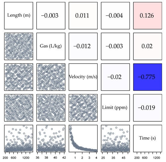 A total of 300 input samples were generated based on the ranges mentioned above, and then these models with specific parameter values were constructed and simulated in Ventsim software to predict the post-blast re-entry time. In total, 300 pieces of data were archived herein as described in Appendix A. The correlation matrix of the dataset is presented in Figure 3. The distributions and correlation coefficients for any two parameters are presented in the lower and upper of this figure, respectively. For the lower, it is clear that the relationship between the inputs and outputs is nonlinear where only the relationship of velocity versus time reveals a distribution similar to a negative exponential. For the upper, the darker the blue, the stronger the negative correlation. Conversely, the lighter the red, the weaker the positive correlation. As can be observed, the correlation coefficient between the four input parameters is low, as they are independent of each other. Additionally, both length and velocity show statistically significant relationships with the time, after significance tests. Despite the fact that gas and limit have lower correlation coefficients, these parameters still remain valid for the subsequent comparative analysis with the empirical formula.