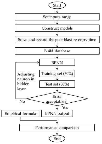 Therefore, this paper aims to develop a BPNN model for predicting the post-blast re-entry time. The rest of this study is organized as follows. The section titled “Model process and data preparation” introduces the construction of models used, as well as the process of database establishment, including the selection and analysis of parameter ranges. The section titled “Methodology” describes the algorithm of BPNN as well as the process of calibrating the empirical formula in detail, in addition to four indicators adopted to evaluate the performance of proposed models. The section titled “Results and discussions” contains the description of building the architecture of the BPNN and a performance comparison of both models for the time prediction. The section titled “Algorithm embedding” exhibits one software developed based on the proposed models. In the last section, the main conclusions and future development are given.