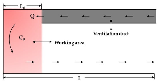 The schematic of ventilation in the longitudinal profile of the roadway is presented in Figure 5. It is given that the length of the working area and roadway are L0 and L, respectively. The area of roadway is S. The fresh air volume discharged from the ventilation duct is Q and the toxic gases concentration uniformly distributed in the working area of volume V is C0 at the initial moment. According to the flow balance, the amount of toxic gases removed after time of ventilation is Q × . Hence, the concentration C after T time of ventilation can be calculated by the following: