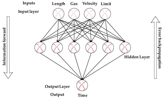 BPNN is a classical supervised learning method fusing the feedforward neural network and the back-propagation algorithm. It has been used in many fields and achieved excellent performance because of its capabilities of outstanding nonlinear fitting and generalization. For instance, Li et al. [] have successfully used a BPNN model to predict the stress values when evaluating pillar stability. Zhao et al. [] applied an integrated model based on the traditional BPNN to predict air pollution concentration and demonstrated that the method is more practical. Hence, BPNN was chosen in this study for predicting the post-blast re-entry time. There are five steps, namely, initialization of weights and biases, feedforward propagation of data, back-propagation of error, optimization of weights and biases and judgment of termination conditions.