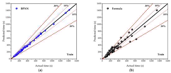 In order to compare the performance of both models more exactly, the regression diagrams in the training phase and the testing phase are described in Figure 7. The horizontal axes represent the actual time. The vertical axes render the prediction value obtained from the BPNN and the empirical formula. The slope of diagonal lines with the black color is 1. Other radical lines with deviations of 10% and 30% from the diagonal lines are also drawn in this diagram. Taken as a whole, the BPNN model has a higher accuracy than does the empirical formula in both sets, because the data points are closer to the diagonal line, whereas some data points obtained from the empirical formula are far outside of the line of 30%, especially in the testing phase. It can also be seen that most of them are larger than the actual time when the ventilation time required is larger than 400 s. At the same time, the BPNN in the testing phase has a larger error than in the training phase, but these data points are almost limited to the radical line of 10%. Hence, the BPNN model can offer more stable performance and more accurate results.