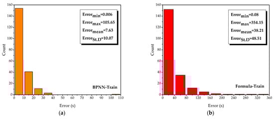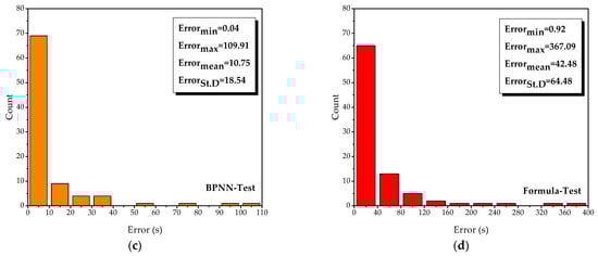 Figure 8 illustrates the error distributions of both models in the training phase and testing phase and some statistical indicators, i.e., the minimum of error (Errormin), the maximum of error (Errormax), the mean of error (Errormean) and the standard deviation of error (ErrorSt.D) are contained in this figure as criteria. The horizontal axes represent the error values between the actual time and the predicted time. The vertical axes are the count within a specified error range. Accordingly, the higher the error bar near the origin and the lower the statistical indicators are, the smaller the model error. As can be realized, the BPNN shows promising results because the region of horizontal axes of the first bar is only from 0 to 10 in the BPNN model when the count of the first bar is almost equal in both models. Additionally, it can be observed that the empirical formula has similar performance in both the training phase and the testing phase.