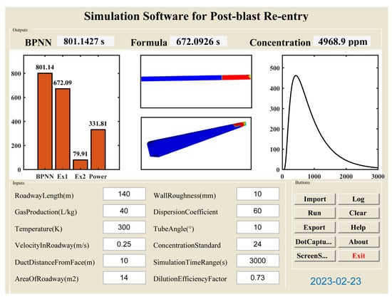 Given the complicated environment on the site and the inconvenience of running code in the engineering practice, some scientists have performed a lot of work on the application of construction schedule methods, such as the use of software. Song et al. [] developed a universal engineering construction system simulation software for the construction schedule visualization simulation of hydraulics and hydropower. Wang et al. [] embedded a ventilation time function in existing software to replace the empirical values for the construction processes and schedule arrangement. In this study, the trained BPNN model was embedded into an existing software module named Simulation Software for Post-blast Re-entry to enhance the performance and facilitate practical use in the central control room located on the surface (see Figure 9). It can be seen that the prediction time obtained from the BPNN model is displayed as both numeric and bar values. Additionally, some optimizations have been applied to the software based on this study. For example, the standard concentration can be input more flexibly according to the requirements rather than using the fixed one. The dilution efficiency factor in the empirical formula was also appended to this software to provide more reference information for users in the period of decision-making. Furthermore, the software can also be utilized to support the formulation of a preliminary schedule. To respond to the call to develop an intelligent mine, interfacing with the mine’s integrated system will be the object in future research.
