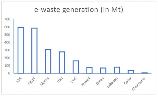 Over the past ten years, E-waste production has increased by more than 60% in Arab countries, from 1.8 Mt to 2.8 Mt, with a 0.1% management rate. EEE-POM has surged up to 30%, totaling 3.2 megatons (Mt/8.8 kg/Inh) in 2010 to (4.1 Mt/9.5 kg/Inh) in 2019. The largest E-waste generation per country is (595 kt/13.2 kg/Inh) of E-waste, increasing up to (0.6 kt/0.7 kg/Inh), showing significant diversity in the region. The E.E.E. production is relatively low, whereas E-waste generation and EEE-POM are interlinked positively with G.D.P. Increasing the G.D.P. for P.P.P. resulted in an increase in the EE-POM for Arab countries. The EEE-POM per inhabitant is the largest in the case of Qatar (24.9 kg/Inh), while it is lowest at 0.8 kg/Inh in Comoros. In terms of absolute value, Egypt is the second largest E-waste generator. It has the highest EEE-POM ranking at 1.1 Mt, followed by Saudi Arabia (758 kt), Iraq (459 kt), and Algeria (458 kt) [,]. Figure 3 depicts the E-waste Production in Arab Region.