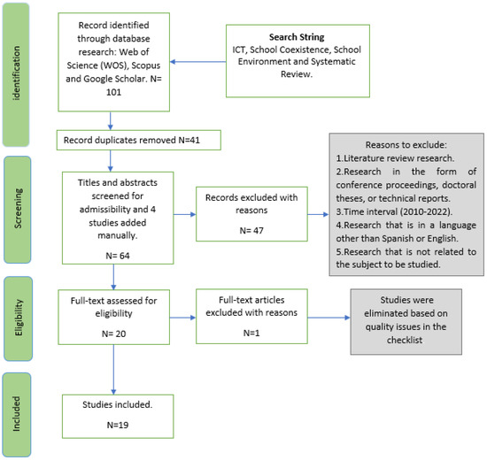 The inclusion criteria established were (a) articles published between 2010–2022, (b) articles published in any language, (c) scientific articles published in peer-reviewed journals and (d) the study evaluates and implements technology as a didactic resource for the improvement of school coexistence. On the other hand, we excluded studies that (a) did not address the use of technologies for school coexistence, (b) review articles, conference proceedings, book chapters, conference abstracts, technical reports, theses, etc., and (c) articles published before 2010. Conference presentations and doctoral theses were excluded, as we assume that high-quality research is published in the databases discussed here.