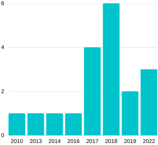 The search determined in the aforementioned databases resulted in a combination of scientific papers, ranging from 2010 to 2022. The analysis of the selected articles (16) made it possible to determine that the productivity over this period of time shows the progressive emergence of technology in the field of school coexistence in recent years. This increase occurs especially from 2017 onwards, where the production in this field increases considerably compared to previous years. Analysing these results, it can be seen that at the beginning of the last decade, there is practically no research on the subject, highlighting a reduction in the publication of articles during the years 2020 and 2021, as we can see in Figure 2. This aspect may be due to the COVID-19 pandemic, where academic activity was slowed down due to the closure of educational institutions.