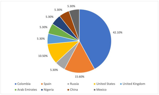 Figure 3 shows that the main country where these studies have been carried out is Colombia (42.1%), followed by Spain (15.6%), the United States (10.5%) and other countries such as Russia, the United Kingdom, the United Arab Emirates, Mexico, China, and Nigeria (6.3%).